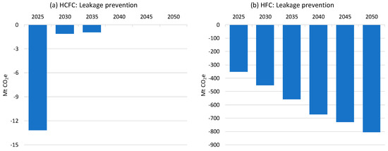 Climate benefits due to refrigerant leakage prevention: (a) HCFC mitigation and (b) HFC mitigation. (Please note the scale differences).