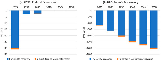 Climate benefits due to end-of-life recovery: (a) HCFC mitigation and (b) HFC mitigation. (Please note the scale differences).