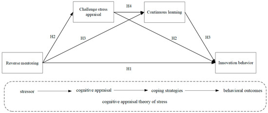 Individuals tend to exhibit positive and proactive behaviors when they perceive stressors as challenges rather than threats [30]. First, appraising stressors as challenges typically brings about positive psychological experiences for employees, such as enthusiasm, hope, and aspiration [31]. These positive emotions contribute to enhancing innovative thinking and initiative, thereby leading to more vigorous participation in innovative behaviors [32]. Second, employees who appraise stressors as challenges view these stressors as opportunities for advancing their personal goals and growth, holding the belief that successful coping with stressors will be rewarded accordingly [33]. This expectation might motivate employees to invest more time and energy and engage in problem-oriented proactive behaviors [34], such as conducting information and resource searches, experimenting with new working methods, and responding to work demands resulting from reverse mentoring in a more flexible manner. This contributes to the generation and implementation of innovations. Based on the above points, the following hypothesis was proposed.