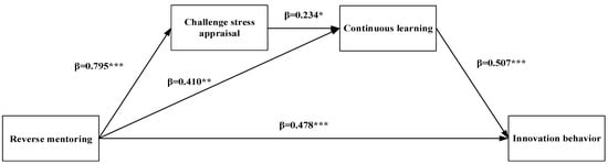 After removing insignificant paths to select the optimal model, this study employed Mplus 8.0 to construct a structural equation model for testing. Four nested competitive models were established based on the theoretical model. Competitive Model 1 only removed the reverse mentoring → continuous learning path. Competitive Model 2 only removed the challenging stress appraisal → innovative behavior path. Competitive Model 3 transformed into a fully chained mediation model by deleting both the reverse mentoring → continuous learning and the challenging stress appraisal → innovative behavior paths. Competitive Model 4 simultaneously removed the reverse mentoring → innovative behavior and challenge stress appraisal → continuous learning paths. The results, as shown in Table 5, indicated that both the parsimonious model (Competing Model 2), after removing insignificant paths, and the theoretical model exhibited better-fit parameters than the other models. Although there was no significant difference between the parsimonious model (Competitive Model 2) and the theoretical model as a whole (Δχ2 = 0.454, p > 0.05), the parsimonious model demonstrated superior fit parameters in some respects. Therefore, the parsimonious model, after removing insignificant path coefficients, was determined to be the optimal model.