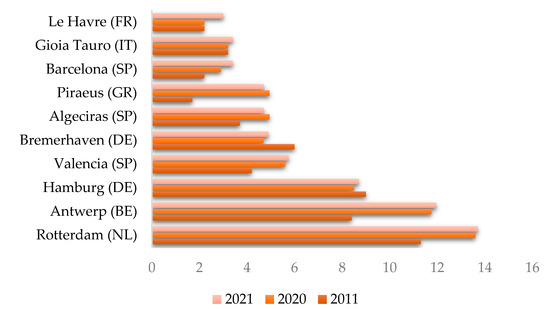 Top 10 EU ports handling containers in 2011, 2020, and 2021. Note: million TEUs; twenty-foot equivalent unit, unit of volume equivalent to a 20-foot ISO container [25].