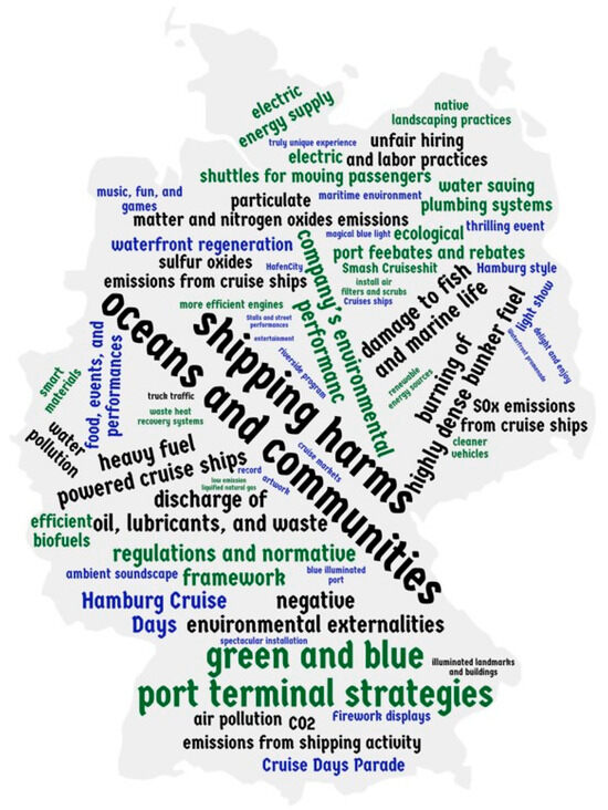 Word cloud superimposed on a map of Germany (map produced with verbalized expressions from the conversations with festival goers. Words in blue font color represent positive comments about the event, while words in black and green font colors represent negative comments and ideas about improvements to the shipping and cruising industries, respectively).