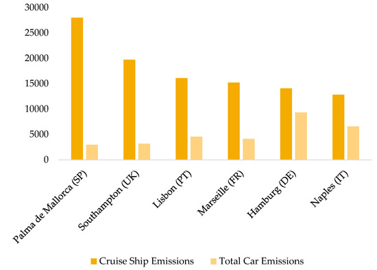 Absent from this easily visible and choreographed excitement of greeting the incoming cruise and celebrating the hospitality of the receiving city was the hidden negative environmental externalities created by the cruise industry of burning high polluting diesel fuel [69]. Very few cruises are yet compliant with the more stringent IMO’s 2020 international law regulating the industry, which requires these large vessels to install air filters and scrubs [18,70]. Figure 4 shows SOx emissions from cruise ships compared to automobiles in selected European port cities. Table 2 shows a set of air pollution indicators, including particulate matter (PM) and nitrogen oxides (NOx) emissions from cruise ships and sulfur oxides (SOx) emissions from cruise ships, specifically for Germany as a whole and the City of Hamburg in particular.