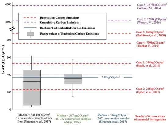 In countries in the Global North, four studies have included embodied carbon emissions as an indicator in the renovation of industrial heritage sites. In the literature, several researchers have conducted life cycle assessments, focusing on embodied carbon, to analyse the environmental impact of the renovation of industrial heritage to support carbon reduction or offsetting of the project [9,20,21,22]. In addition, Watson conducted an embodied carbon assessment using the embodied energy calculator for three heritage industrial renovation projects in the Global North to judge the environmental value of building reuse [23].