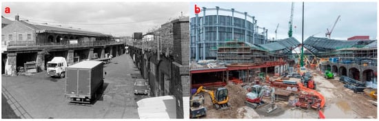 - Marshall, P. Eastern Coal Drops, Kings X Goods Yard, Kings Cross, Camden, 1989 89-4f-45. Available online: https://www.flickr.com/photos/petermarshall/50922153712/in/album-72157717983943477/ (accessed on 10 October 2024).