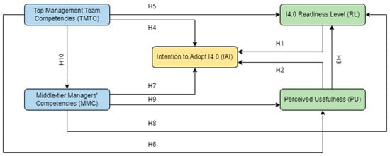 Top managers are pivotal in identifying emerging transformative changes and driving organizational implementation [47]. In this process, organizational competencies comprising top managers’ skills, knowledge, and capabilities enhance the perceived usefulness of Industry 4.0 technologies. This perceived usefulness, in turn, significantly influences the organization’s intention to adopt Industry 4.0 innovations [48].