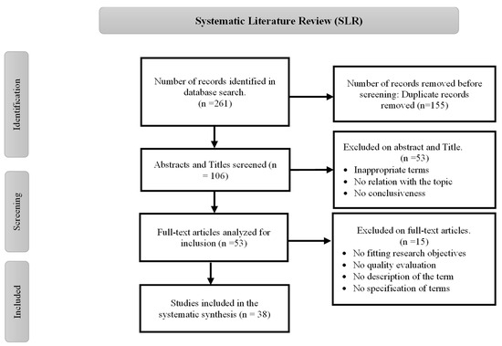 The initial search results included 261 articles. Figure 1 shows each step in the development of the SLR study. In the final stage, 38 articles were selected and categorized as relevant as possible, following the definitions, objectives, applications, and findings [56].