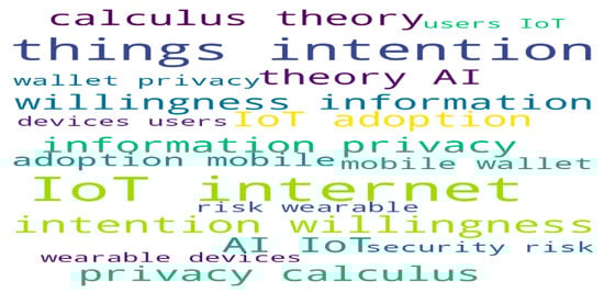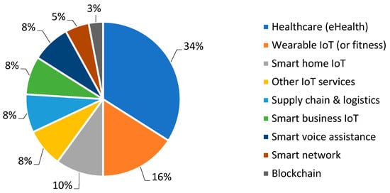 IoT is a technological concept in which various objects (such as machine-to-machine and humans-to-machine) are linked and can switch on and off the internet to employ software and automation procedures for smart systems [94]. According to Sung and Jo [95], in the context of IoT service, the perceived risk denotes the perception that an individual is uninformed of the repercussions of activity because of confusion regarding a specific behavior. While using IoT services, an individual’s intention to offer personal information significantly affects the user’s information privacy concerns. Furthermore, privacy risk, privacy experience, privacy policy, and information control significantly impact individual intentions to disclose personal information to use IoT services. Likewise, Hsu and Lin [96] highlighted that perceived value significantly determines IoT service adoption. Also, perceived benefits significantly affect the intention to adopt IoT services. Overall, the charts suggested that, while AI-powered IoT is a diverse field with applications in many areas, healthcare-related technologies are currently the most significant, possibly due to the importance of advancements in this field. Meanwhile, technologies like blockchain have not yet reached the same level of market penetration.