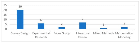 Furthermore, in Figure 5, regarding the type of research, most papers (n = 20) were survey designs, six (n = 6) papers were experimental research designs, one was for a focus group interview, one paper was a mixed-method approach, and two papers were mathematical modeling. Surprisingly, out of 38, 7 (n = 7) articles were literature reviews. Most of the samples were used by the student population, third parties (i.e., commercial data collection platforms such as M-Turk or Prolific), and online reviews.