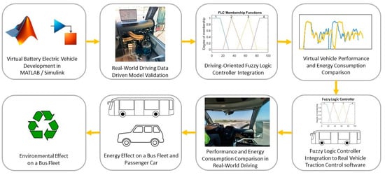 In this study, an FLC-based energy management strategy was developed and tested in single-source battery electric vehicle architecture. In the development process of the energy management strategy, a virtual vehicle model was created in MATLAB/Simulink (version R2022a) and validated with real-world driving data. The first developed strategy was integrated into the virtual vehicle model. Energy consumption reduction and dynamic performance were examined. Based on the remarkable results obtained in the virtual vehicle model, the developed energy management strategies were applied to the real vehicle traction control software. The optimum energy management strategy was defined according to the success criteria. The energy consumption reduction obtained in real driving was evaluated on the energy consumption of an electric bus fleet and a passenger electric vehicle. In addition, the effect of the consumption reduction on carbon emissions was estimated. The general flow of this study is explained in Figure 1.