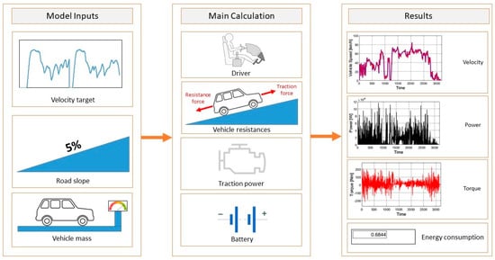Since the effect of this study on the real vehicle would take a long time to be seen and would be costly, a virtual vehicle model was created. The virtual vehicle model works with 3 inputs: speed, slope, and mass and gives the vehicle’s performance and consumption outputs. During this process, the virtual driver, which shows realistic behavior, decides on the required power and torque value according to the speed target and drives the system. The subsystems include motor efficiency, dynamic resistances, and battery calculations. The operations of the virtual EV model are shown in Figure 2.