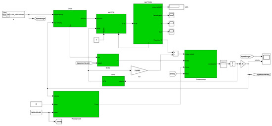 The virtual electric vehicle model, which was constructed according to the basic dynamic calculations in the reference [8], is in Figure 3.