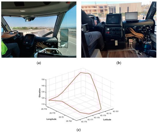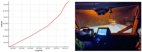 Following the positive results seen in the integration of FLC-V1 into the virtual vehicle model, the developed strategy was integrated into the real vehicle traction control software. Since the real traction vehicle control software supports the MATLAB/Simulink base, the control set created in the virtual vehicle model was successfully transferred to the vehicle software side as it is. In addition, the control strategy was made parametric for driving safety and could be turned off instantly when necessary. To see the integrated energy management strategy in real driving, the 2.125 km test route whose coordinates are shared in Figure 9 was determined. The vehicle ran 2 laps each with the normal and FLC-V1 and FLC-V2 integrated software (MATLAB/Simulink R2019b) on the specified route.