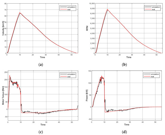 Data−driven validation results: (a) vehicle speed, (b) motor speed, (c) motor torque, (d) motor power.