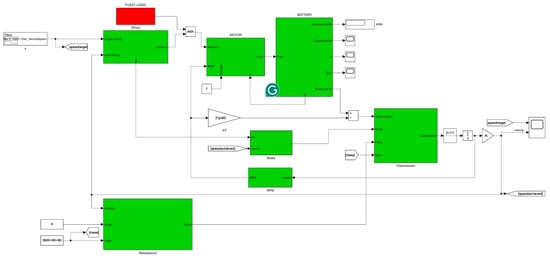 The driving-oriented vehicle energy management strategy includes Type-I FLC. Type I FLC is widely used in many engineering and control applications. More complex systems such as Type-II or Type-III can be preferred when the level of uncertainty and fuzziness needs to be addressed in more detail. The developed strategy places the virtual battery in the motor subsystem of the EV model. The output of the controller is the motor torque limit according to the vehicle speed, pedal ratio, and SoC values. If the torque value determined according to the RPM and demand ratio in the motor subsystem does not exceed the limit determined by the FLC, the torque requested by the system is allowed; otherwise, the torque is transferred to the system at the decision value given by the controller. The virtual vehicle model with FLC integration is shown in Figure 6.