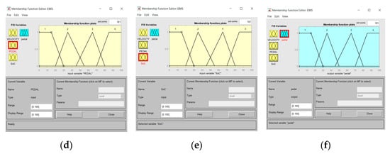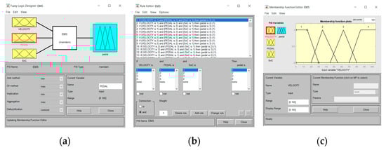 FLC tool interfaces: (a) main page, (b) ruler viewer, (c) velocity membership functions, (d) pedal ratio membership functions, (e) SoC membership functions, (f) torque membership functions.