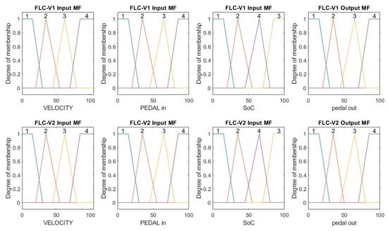 Two different FLCs were designed to comparatively examine the effects on electric vehicle dynamic performance and energy consumption. The systems, whose membership function intervals and decision-making rules are quite similar, are named FLC-V1 and FLC-V2. The membership functions of FLC-V1 and FLC-V2 are in Figure 8. The target of the designed energy management system is to reduce energy consumption without sacrificing vehicle dynamic performance. In this respect, the success criterion of the energy management system has been determined as a minimum of 5% reduction in energy consumption and a maximum of 5% reduction in dynamic performance loss. The performance evaluation is calculated based on the speed difference that can be achieved at the end of a full-throttle start on a 7% slope in the first 13 s of the ride.