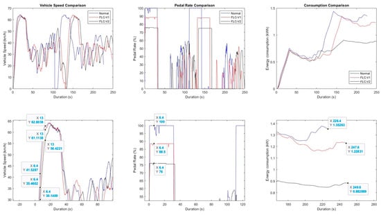 Figure 11 shows the speed, pedal rate, and total energy consumption with and without the FLC integration. According to the results seen in the graphs in Figure 11, FLC-V1 provided a 9.16% reduction in energy consumption, while it showed a 2.69% performance decrease in full-throttle take-off on the ramp. FLC-V2 provided a 34.69% reduction in energy consumption, while it showed a 10.16% decrease in dynamic performance evaluation. With these results, it was seen that FLC-V1 met both dynamic performance and energy reduction success criteria.