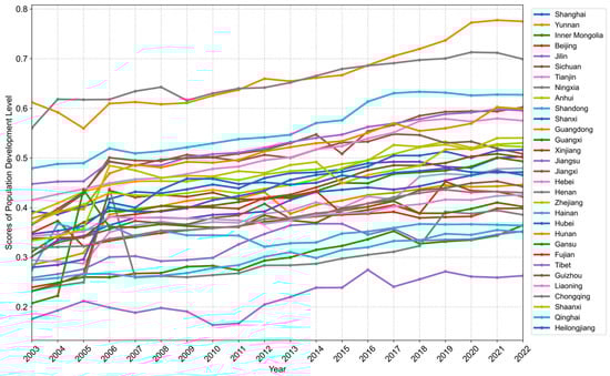 Scores of Population Development Levels for Each Province from 2003 to 2022.
