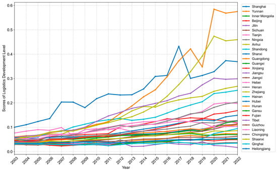 Scores of Logistics Development Levels for Each Province from 2003 to 2022.