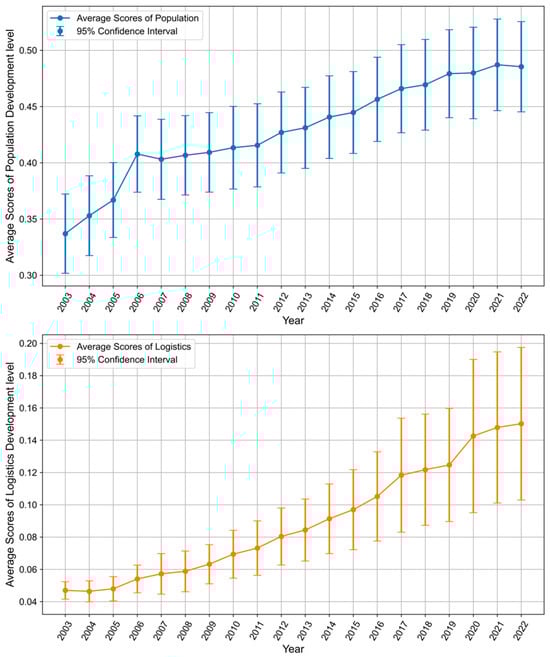 Average Scores of Population and Logistics Development Levels from 2003 to 2022.