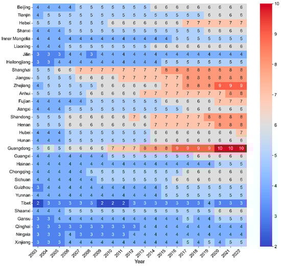 Using Equations (6) and (7), the coupling coordination degrees between population and logistics from 2003 to 2022 for the 31 provinces can be calculated. According to the levels shown in Table 3, the levels of coupling coordination development between population and logistics can be determined, as illustrated in Figure 4. Overall, the levels of coupling coordination development for most provinces increase annually. Though it indicates a yearly improvement in the alignment between population growth and logistics capabilities, significant differences remain among regions. Over the 20 years, economically advanced coastal provinces such as Jiangsu, Zhejiang, Guangdong, and Shanghai have seen the fastest growth rates and highest levels of coupling coordination. Since 2020, Guangdong has achieved an ‘excellent coordination’ level. Provinces like Anhui, Shandong, and Henan reach a ‘medium coordination’ level by 2022. In contrast, provinces like Tibet, Gansu, and Jilin in the west and northeast exhibit lower levels of coupling coordination development. These regions are still at a ‘disorder’ level with slow improvements over nearly two decades.