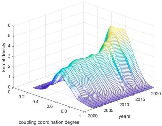 This study employs the Kernel Density Estimation (KDE) method to analyze changes in the coupling coordination degrees between population and logistics from 2003 to 2022. Utilizing Equations (8) and (9), the kernel density values are computed, which allows a visual display of the distribution and evolution trends of the coupling coordination degrees, as shown in Figure 5.