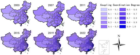 With the aid of the coupling coordination degree results in Section 3.3, heatmaps are created using ArcGIS 10.6.1 software for the years 2003, 2007, 2011, 2015, 2019, and 2022. These maps are helpful in analyzing the spatial distribution characteristics of the coupling coordination degrees between population and logistics, as shown in Figure 6.