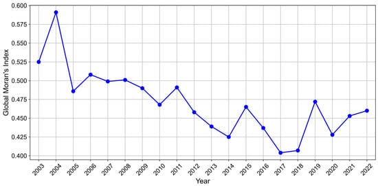 Table 5 shows that the global Moran’s index passed the significance test. This indicates that the coupling coordination degree between population and logistics among the 31 provinces exhibits strong spatial autocorrelation and distinct spatial clustering. In geographic terms, provinces that are closer to each other often have similar coupling coordination degrees. From Figure 7, the global Moran’s index from 2003 to 2022 generally shows a fluctuating downward trend, which suggests a decrease in spatial autocorrelation among regions. It is likely due to the fact that some regions are developing rapidly while others lag behind, culminating in a decrease in overall spatial correlation.