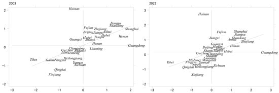 While the global Moran’s index reveals the spatial clustering effects in the coupling coordination degree across the 31 provinces, it is still not possible to precisely determine the level of spatial correlation between each province and its neighboring provinces. To further examine the local spatial characteristics of the coupling coordination degrees between population and logistics, local Moran’s indices for the years 2003 and 2022 are calculated, and local Moran scatter plots are constructed, as shown in Figure 8.