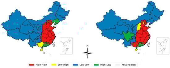 The fourth quadrant is the ‘high–low’ type. Guangdong and Liaoning are in this area by 2003, and Guangdong and Sichuan are in this area by 2022. Guangdong is an economically strong province with population attraction and robust logistics capabilities. Consequently, it displays a higher coupling coordination degree than its neighbors, locating it on the right side of the fourth quadrant. Sichuan, a pivotal city in the Western Development strategy, has experienced rapid economic expansion lately. This expansion has transformed it into a regional logistics hub, shifting its status from ‘low–low’ to ‘high–low’ type. Table 6 displays the different clustering types for each province. Figure 9 visualizes the changes in the spatial clustering types of the coupling coordination degree between population and logistics.