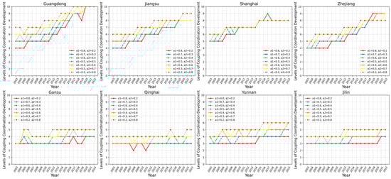 To ensure the objectivity and clarity of the sensitivity analysis, four provinces with higher levels of coupling coordination development between population and logistics (Guangdong, Jiangsu, Shanghai, and Zhejiang) and four provinces with lower levels (Gansu, Qinghai, Yunnan, and Jilin) are selected. The results are shown in Figure 10. Under seven different parameter combinations, the provinces of Guangdong, Jiangsu, Shanghai, and Zhejiang all show a clear upward trend in the levels of coupling coordination development. In contrast, the provinces of Gansu, Qinghai, Yunnan, and Jilin show slower improvements in their levels of coupling coordination development over 20 years, consistent with the findings in Section 3.3.