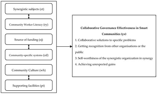 The conceptual framework presented in Figure 1 provides a comprehensive structure for studying the factors that influence the effectiveness of collaborative governance in smart communities. It identifies four key sets of factors, each playing a crucial role in shaping collaborative outcomes. Firstly, community-specific subjects (wh) encompass the various stakeholders involved in the collaborative governance process. These stakeholders include community residents, organizations, government agencies, and businesses. Each group brings unique perspectives and resources, making their involvement vital for effective governance. Secondly, supporting facilities (pt) refer to the physical and technological infrastructure that underpins collaborative governance in smart communities. This includes community centers, online platforms, and communication networks. Robust infrastructure is essential for facilitating interaction and coordination among stakeholders.