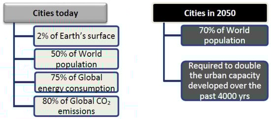 Cities across the globe, as predominant centers of human settlement and activity, are a major driver of economic growth. In the current ongoing debates and projections, over 53.85% of the global human population is living in urban areas [9], which is expected to reach 66% by 2050 [16]. Half of the world’s population lives on just 1% of the land [17]. Furthermore, there lies a close resemblance between the population density map and gross domestic product (GDP) density map [18], indicating dense human settlements as predominant centers of economic activity. GDP density is a measure reflecting GDP per square kilometer of area. With an increasing proportion of the world’s population rapidly becoming urbanized (refer to Figure 2), the role of cities cannot be undermined. Their role is critical for sustainability.