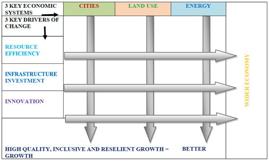 Author-developed schematic showing three major economic systems and key transformational drivers, created using ideas discussed in [20]. Arrows indicate an intricate simultaneous interplay of the three major economic systems and key transformational drivers leading to a wider economy and ahigh quality, inclusive and resilient growth which implies a better growth outcome. Note: Cities include urban transport, land use includes forests, and innovation includes economy-wide innovation.