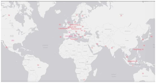 Geographic distribution of smart city research publications by country, highlighting regional academic leadership and focus areas in urban sustainability (adapted from Scopus and visualized using National Geographic Map Maker).