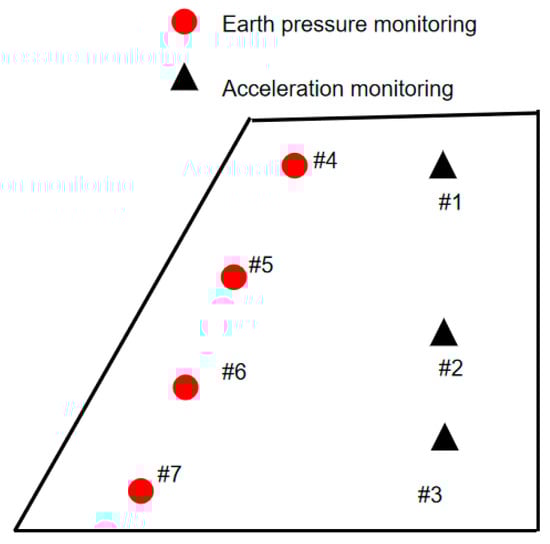In terms of the measurement limitations of these sensors, the working temperature range of the DYB-300 earth-moving pressure sensor is −20 °C to 60 °C. Insulation or cooling measures need to be taken in extremely low- or high-temperature environments. Although the ICP-6021-type acceleration sensor has good shock resistance performance, when subjected to a violent shock exceeding the measurement range, it may lead to sensor damage or an increase in measurement error. In practical use, it is necessary to equip the sensor with appropriate protective devices, such as protective sleeves and shock-absorbing pads, based on the characteristics of the on-site environment of the project, to ensure the stable operation of the sensor under complex working conditions and obtain accurate and reliable monitoring data, #1–#3 are acceleration monitoring, #4–#7 are earth pressure monitoring.