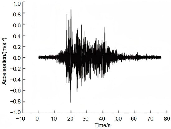 In this model test, EL-Centro was selected as the test waveform, and the excellent frequency band with the strongest response was selected for loading. The time–history curve of the EL-Centro wave is shown in Figure 4, and its loading system is shown in Table 3.