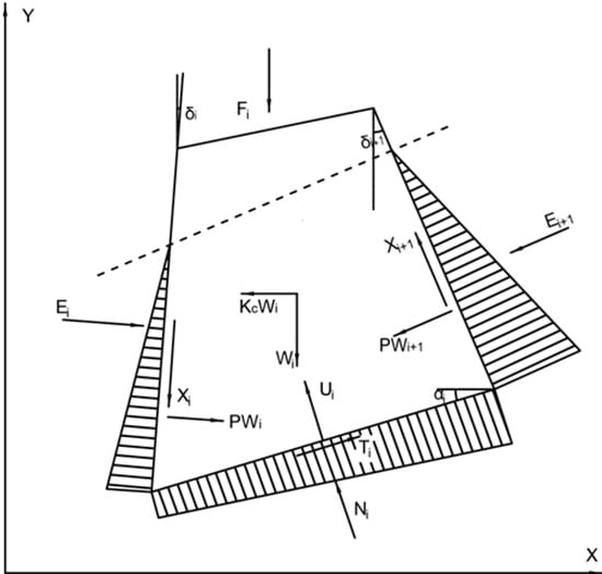 Ti and Ni are, respectively, the shear force and normal force acting on the bottom surface of strip I; Wi is the weight of strip I; Xi and Xi+1 are the shear forces acting on the I side and i+1 side, respectively; Ei and Ei+1 are the normal forces acting on the I side and i+1 side, respectively; Fi is the external load acting on the top of the slope; δi and δi+1 are the angles between the I side and the i+1 side and the vertical direction, respectively; αi is the angle between the sliding plane of the I block and the horizontal direction.