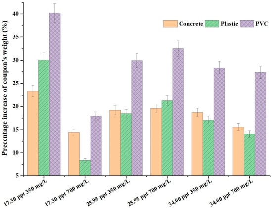 Comparison of biofilm growth, represented by the percentage increase in coupon’s weight, on different coupon materials. The X-axis presents the levels of salinity in ppt and TOC concentration in mg/L.