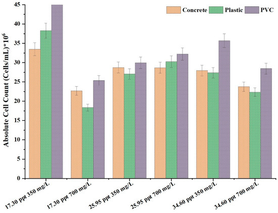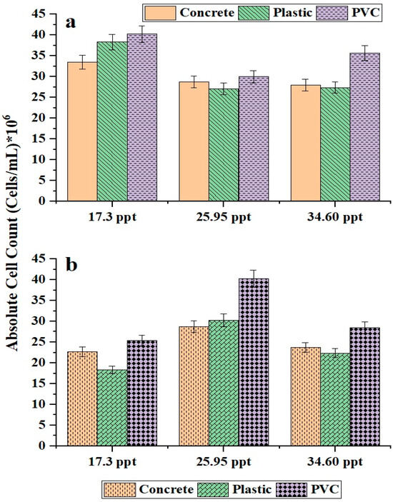 The present study examined the impact of two distinct TOC concentrations, 346 and 692 mg/L, and three distinct salinities: 34.60, 25.95, and 17.30 ppt on biofilm attachment. Figure 3 and Figure 4 illustrate the impact of varying carbon concentrations and salinity on the formation of biofilm. The biofilm growth on three coupons—concrete, plastic, and PVC—decreased by 8.94, 21.67, and 22.26%, respectively, as the TOC increased from 346.4 to 692.8 mg/L at a salinity of 17.30 ppt. Similarly, the biofilm growth on three coupons—concrete, plastic, and PVC—decreased by 3.11, 2.98, and 1.03%, respectively, when the TOC increased from 346.4 to 692.8 mg/L at a salinity of 34.60 ppt. In contrast, the biofilm growth on three coupons, concrete, plastic, and PVC, increased by 0.42, 2.92, and 2.56%, respectively, as TOC increased from 346.4 to 692.8 mg/L at a salinity of 25.95 ppt. The highest percentage of biofilm attachment on three coupons—concrete, plastic, and PVC—with increments of 23.39, 30.10, and 40.22%, respectively, at a salinity of 25.95 ppt and a TOC concentration of 692.8 mg/L. For cell counts, comparable outcomes were observed. Results indicate a complex relationship between biofilm growth, TOC concentration, and salinity across different surface materials. These findings suggest that low and high salinities with higher organic content conditions may inhibit biofilm development, possibly due to microbial competition or unfavorable changes in nutrient composition. In addition, high salinity may impose stress on microbial communities, possibly leading to reduced colonization or biofilm stability, even with elevated TOC levels. Conversely, a medium salinity with higher organic content promoted biofilm growth across all materials. This condition appears to provide an optimal balance of salinity and organic nutrients that supports microbial colonization and biofilm stability. The most substantial biofilm attachment was also observed under medium salinity levels at the highest TOC concentration.