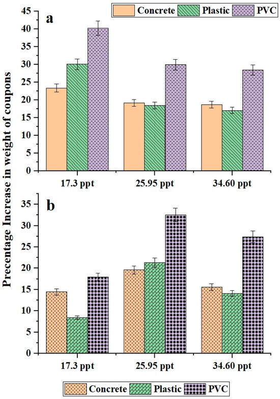 Impact of carbon concentrations and salinities on biofilm growth in terms of weight of coupons (a) TOC 346.4 mg/L, (b) 692.8 mg/L.