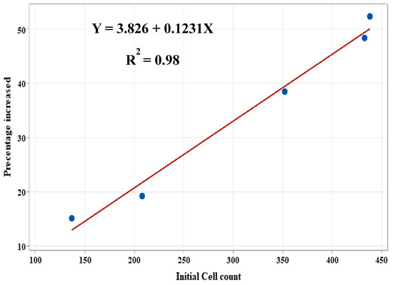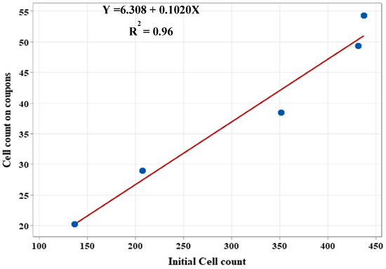 The correlation between biofilm attachment and initial cell count is the term used to describe the relationship between the number of cells that adhere to a surface and the subsequent development of a biofilm. The initial critical stage in forming biofilms is the attachment of cells to the surface of coupons. Organic matter, salinity, and the material of coupons are among the factors that influence the biofilm attachment to a coupon, as previously mentioned in Section 3.2. Likewise, the initial concentration of bacteria in the seawater can also influence the attachment and proliferation of cells on the coupon material. A batch-scale study was conducted in the present study to ascertain the correlation between the initial bacterial cell count and the cell count present on the coupons at the end of the batch study. The batch study employed five sets of seawater with five different initial cell counts. PVC was used as the coupon material for the batch study, as it exhibited the highest biofilm attachment, as specified in Section 3.1. Figure 5 and Figure 6 represent the correlation graph between the initial cell count of seawater, the cell count on coupons, and the percentage increase of biofilm attachment. The results show strong positive linear correlations between the initial cell count of seawater and the cell count on coupons, with a Pearson correlation coefficient (r) of 0.98. Furthermore, the high R2 value (0.96) and p-value (0.003) less than 0.05 indicated that the cells attached to the coupons increased as the initial cell count of seawater increased. Similarly, there is a strong positive linear correlation between the initial cell count of seawater and the percentage increase of biofilm attachment, with an r-value of 0.98. Similar results were reported in the previous study conducted by Faria et al. [10]. Based on the findings of the study, there is a significant correlation between the number of biofilm cells on day 42 and the number of cells present during the “Initiation” phase. Consequently, the biofilm attachment on the coupons depends upon the initial cell count of biofouling organisms in the seawater.