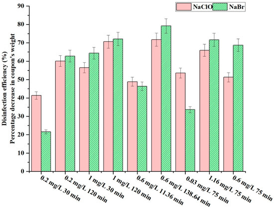 The most common mitigation strategy to prevent biofouling has been chemical removal [16]. A biocide is a chemical compound that induces cell death and is damaging to biofouling organisms, thereby inhibiting biofouling. It accomplishes this by hindering the activity and proliferation of the microorganisms that generate biofouling conditions [29]. A comparison of the disinfection efficacy of NaClO and NaBr was conducted in the current study. Figure 7 and Figure 8 represent the disinfection efficiency (cell count) and percentage decrease in the coupon’s weight. NaClO and NaBr exhibited maximum cell-count removal efficiencies of 95.57 and 97.69%, respectively. Furthermore, the impacts of initial cell concentrations on the disinfection efficacy of NaClO and NaBr were determined. The disinfection efficiencies of both biocides, NaClO and NaBr, were slightly reduced as the initial cell count on the coupons increased. The finding suggests that NaBr exhibited a higher level of disinfection efficiency than NaClO. Similar results were found in previous studies [30,31]. Burton & Margrey [31] conducted a comparative disinfection study in the cooling systems of the Calvert Cliffs Nuclear Power Plant in the United States, which was operated by the Baltimore Gas and Electric Company. The study utilized estuarine water with a salinity of 12 ppt. According to the findings, the colonization of biofouling organisms was reduced by 85% through bromine dosing, while chlorine dosing was inhibited by 79%. This inhibition happened when both chlorine and bromine were administered at a continuous rate of 0.1 mg/L for a period of 20 days. The previous study by Fujioka et al. [30] evaluated the effectiveness of two disinfectants, stabilized hypobromite and chlorine, in controlling biofouling in a reverse osmosis (RO) membrane that processes seawater. The bacterial counts in seawater decreased by 49.47% when the maximum chlorine dose of 5 mg-Cl2/L was applied. Similarly, stabilized hypobromite dosed at the same dosing concentration as the seawater led to an even greater decrease of 99.32%. The results showed that stabilized hypobromite was a better disinfectant for controlling biofouling compared to chlorine.