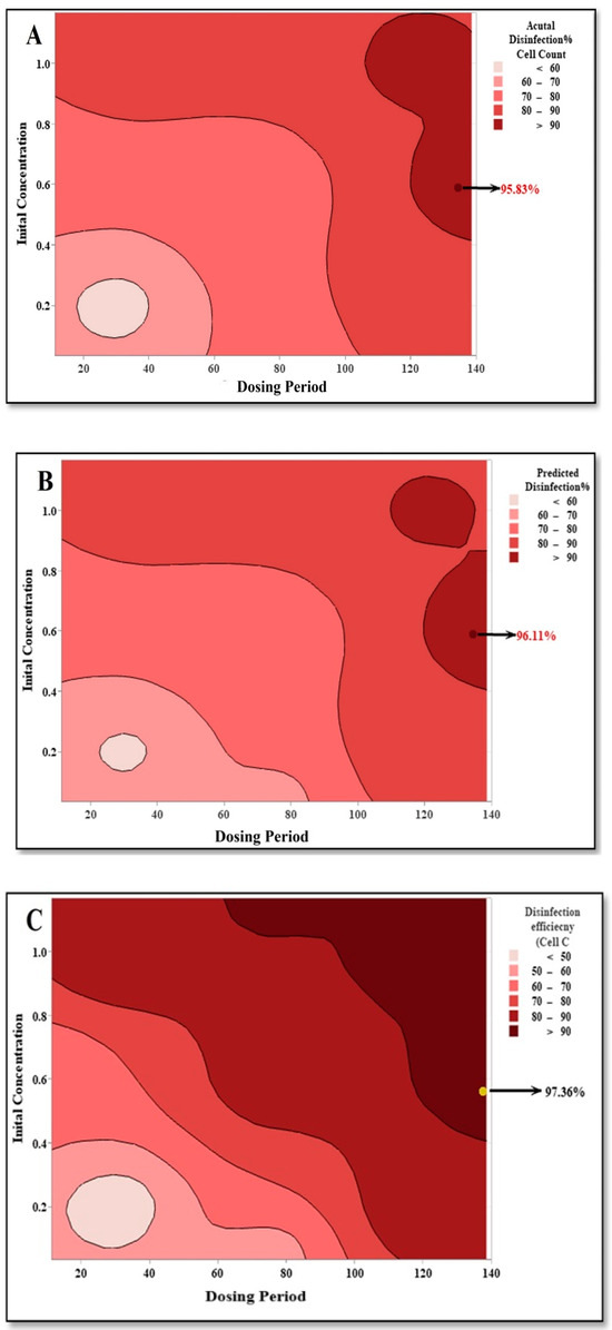 Contour plot of (A) actual and (B) predicted disinfection efficiency (cell count) for NaClO and (C) actual and (D) predicted disinfection percentage (cell count) for NaBr.