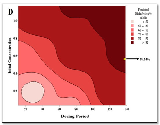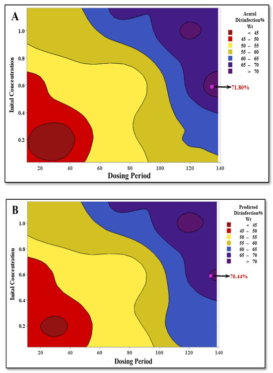 Figure 11 and Figure 12 represent the contour plots, which show the relationship between the dosing period and initial concentration of NaClO and NaBr, respectively. NaClO and NaBr exhibited the highest actual disinfection efficiencies (95.83% and 97.36%, respectively) in terms of cell count at an initial concentration of 0.6 mg/L and a dosing period of 138 min. Similarly, predicted disinfection efficiencies in terms of cell count from the model were confirmed, with an optimal value of 96.11% and 97.84% for NaClO and NaBr, respectively. The maximum actual disinfection efficiencies in terms of coupon weight were 71.80% and 79.20% for NaClO and NaBr, respectively, as determined by the experimental value. The maximum predicted disinfection efficiencies in terms of coupon weight were 70.44% and 78.41% for NaClO and NaBr, respectively, as predicted by the model. The optimum disinfection efficiencies in terms of cell count and coupon weight were achieved for both biocides at an initial concentration of 0.6 mg/L and a dosing period of 138 min. There was a stronger correlation between the experimental values and the model-predicted values, as the maximum disinfection efficiency was achieved at a lower initial concentration of biocides and a longer dosing duration. The disinfection efficiency of NaBr was marginally higher than that of NaClO, as indicated in Section 3.4. NaClO and NaBr exhibited higher R2 values of 0.98 and 0.99, respectively, when a linear fit was performed between the predicted and actual disinfection efficiency in terms of cell count. Similarly, the linear fit of the predicted versus actual disinfection efficiency in terms of coupon weight demonstrated higher R2 values of 0.97 and 0.99 for NaClO and NaBr, respectively. The model-predicted values are not significantly different from the experimental values. Consequently, the model that was developed was well-fitted.