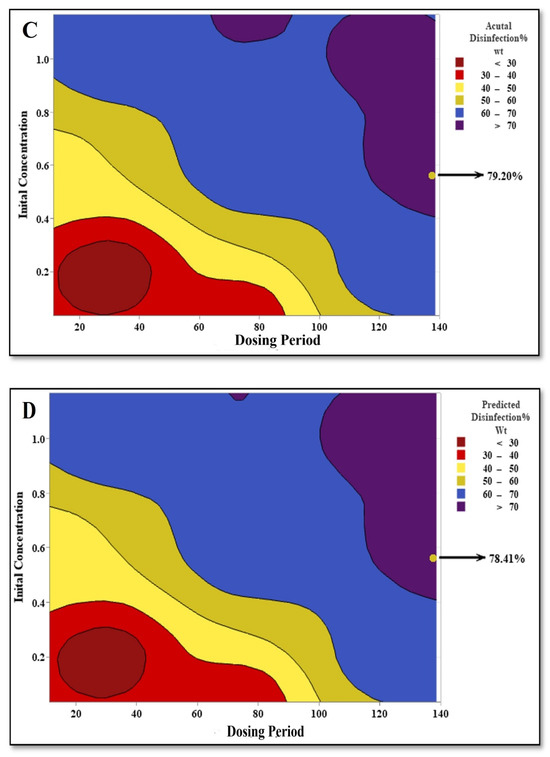Contour plot of (A) actual and (B) predicted disinfection efficiency (Coupon’s Weight) for NaClO and (C) actual and (D) predicted disinfection percentage (Coupon’s Weight) for NaBr.