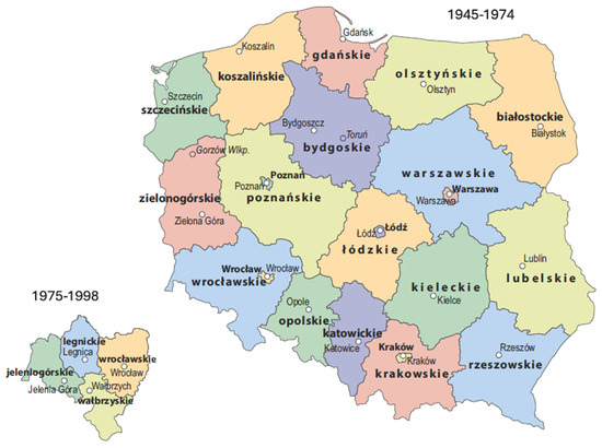 Administrative division of Poland in 1945–1974 and 1975–1998 (explanatory figure). Source: own compilation based on [47].
