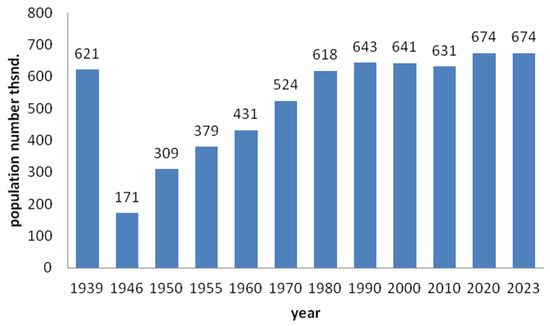 The conducted demographic analysis of Wroclaw shows that in the post-war period, a very high population growth rate was recorded—despite that, however, the capital of Lower Silesia did not rebuild its pre-war demographic potential until the 1980s (Figure 2).