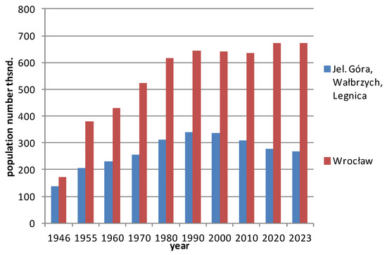 As already mentioned, the Lower Silesia region is characterized by a high percentage of the population residing in cities—this status has persisted continuously since the post-war period. Immediately after World War II, the urban population rate in, at that time, the Wroclaw Voivodship was 40.4%, and by the mid-1960s, the rate in question had already reached 62.6% [18]. The upward trend in urban population continued in Lower Silesia in subsequent years as well. In the voivodships established in 1975, the Wroclaw and Wałbrzych Voivodeships led the way in this respect. The other two voivodships (Jelenia Góra and Legnica) presented an urban population rate approx. 10% lower than the above-mentioned ones but still higher than the national average. Currently, urban population accounts for about 70% of Lower Silesia population. This result ranks the region as second in the country after the Silesian Voivodeship.